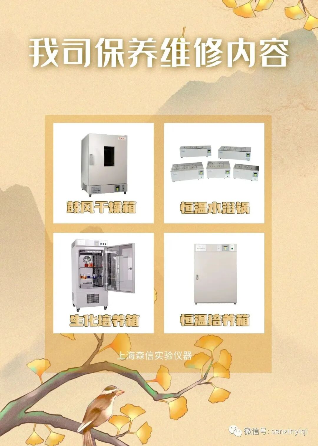 包括电热恒温鼓风干燥箱、真空干燥箱、电热恒温培养箱、生化培养箱、恒温恒湿箱及水槽、水浴锅等实验室恒温仪器的维护保养以及设备检修、技术支持、操作以及注意事项培训等工作。